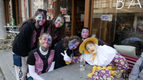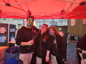 Zwischen dem Arbeiten, Schminken und Mittagessen verging die Zeit wie im Flug und schon gesellten wir uns zu den Mythechroser auf die Bühne, um das Medley zu spielen. Versuchend, sich nicht durch Maschgraden aus dem Konzept zu bringen, legten wir unseren Auftritt solide ab. Weiter gings Richtung Bistro Bären, denn Helfer übernahmen unsere Schicht und wir hatten zwei Stunden frei (jedenfalls die meisten von uns). Der Ansturm war riesig, der Hauptplatz voll und so fingen wir (wieder) früher als geplant an zu Arbeiten. Jetzt ohne Witz, es war sehr schön zu sehen, wie alle freiwillig einsprangen und einander halfen. Das freut mein Pädagogenherz.